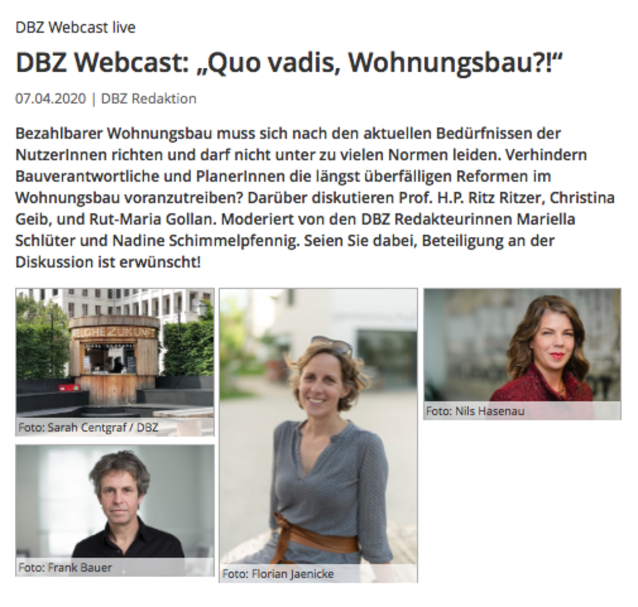 Darüber und zu vielen weiteren Fragen diskutieren Prof. H.P. Ritz Ritzer, Christina Geib, und Rut-Maria Gollan am 15.4.2020 um 13 Uhr beim ersten DBZ Webcast: „Quo vadis, Wohnungsbau?!“