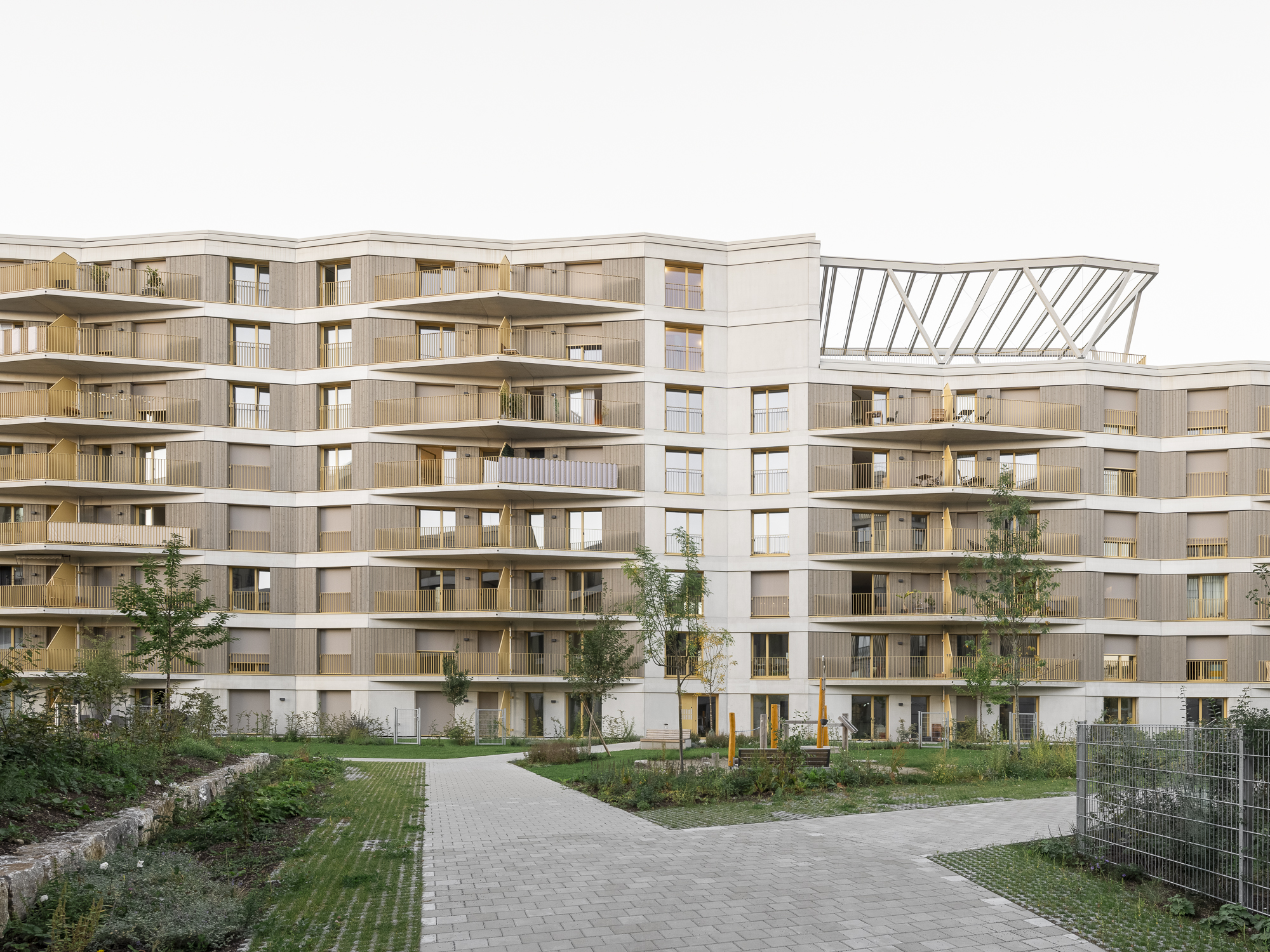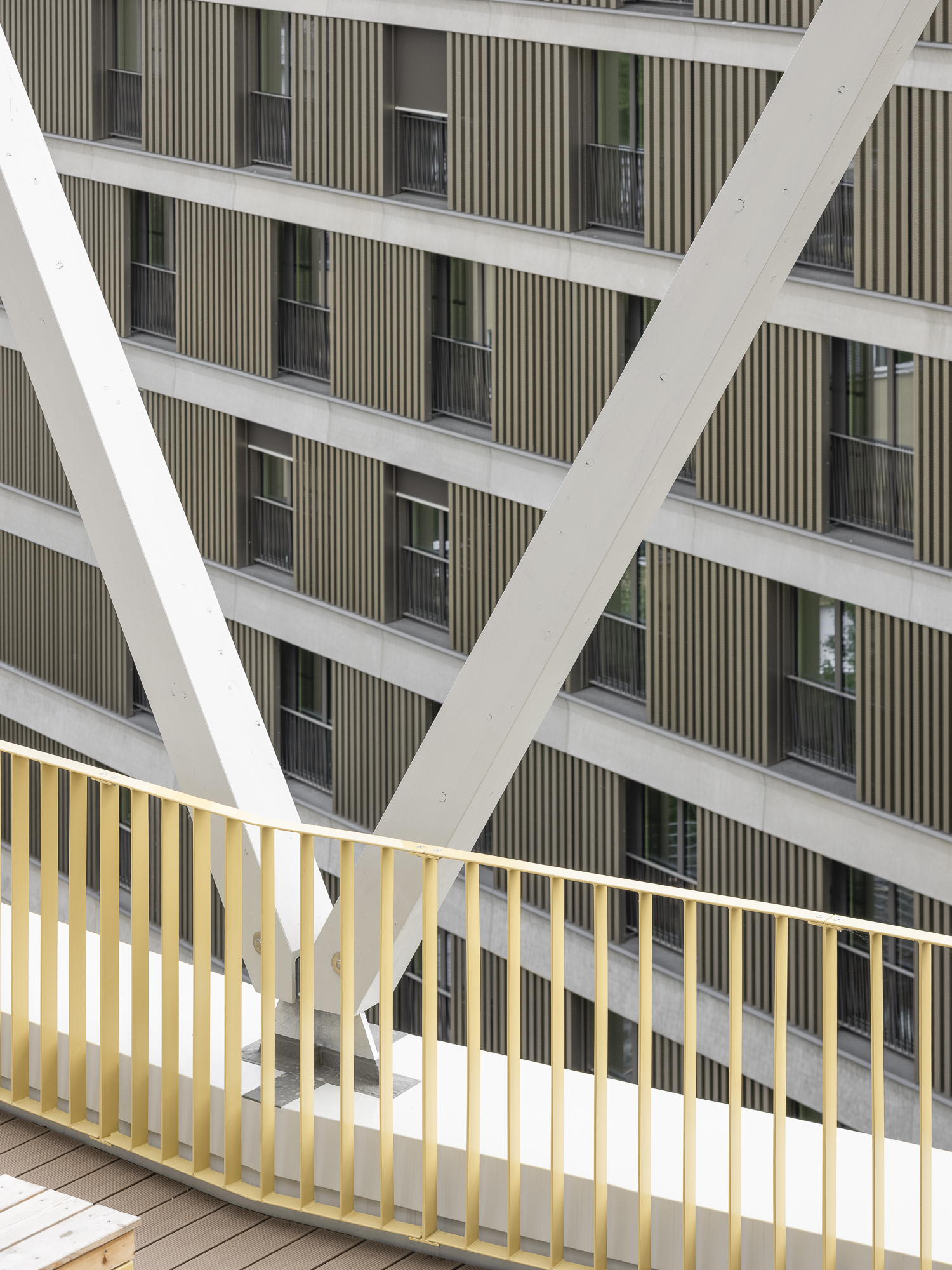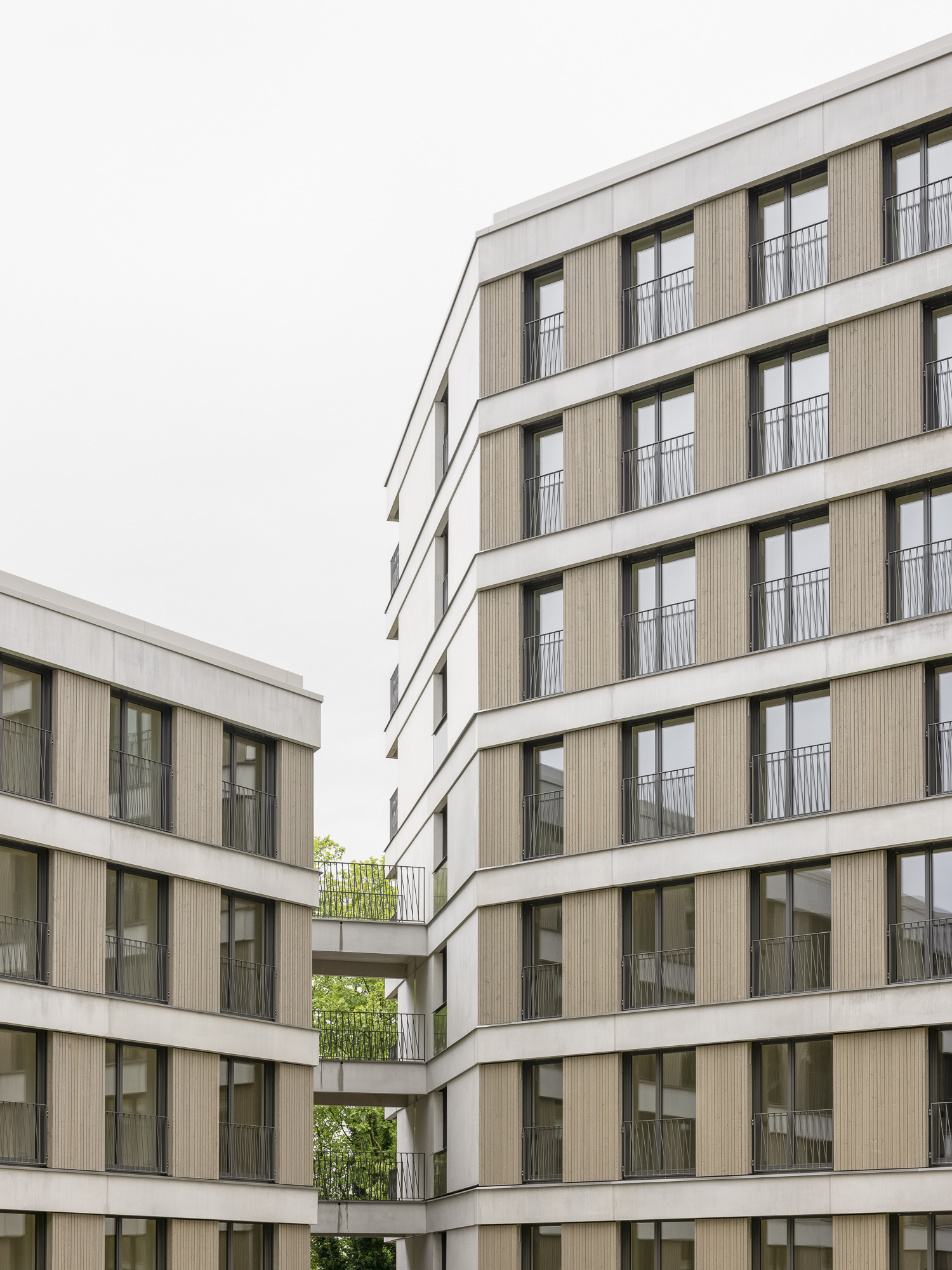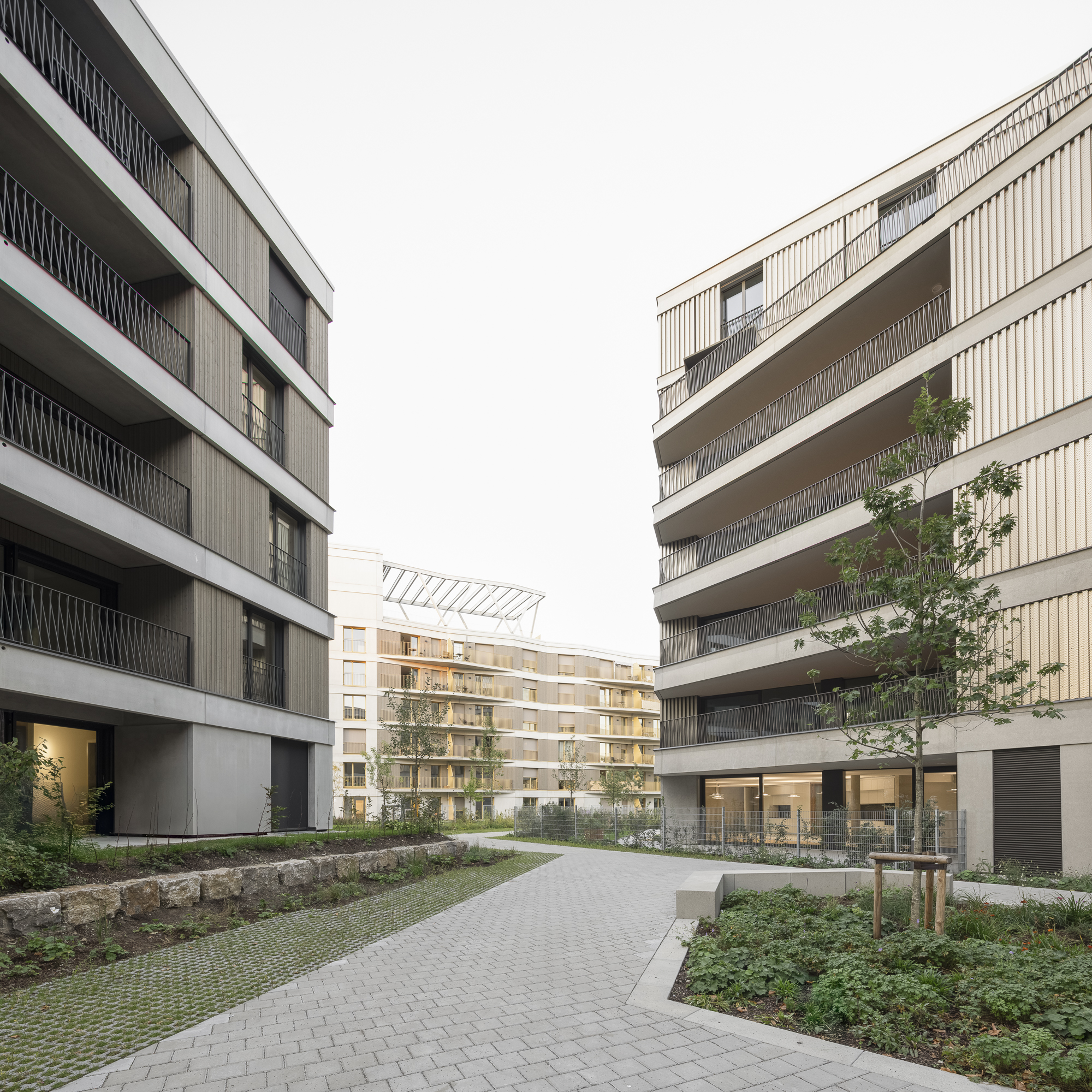 Ergänzt werden die Punkthäuser durch einen längeren, trapezförmigen Riegel im Norden, der durch seine gefaltete Fassadengestaltung gleichermaßen vielfältige Perspektiven ermöglicht und gleichzeitig eine wichtige städtebauliche Funktion übernimmt: Er schützt das Quartier effizient vor der Bahntrasse. Holz- und Betonfertigteilfassaden, variierende Farbnuancen sowie differierende Gebäudetiefen verleihen dem Ensemble eine lebendige, präzise abgestimmte Vielfalt und tragen zur Identität des gesamten Quartiers bei.