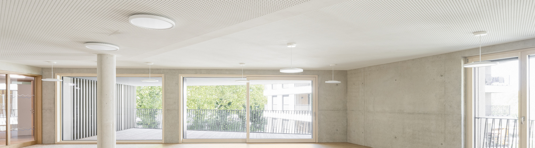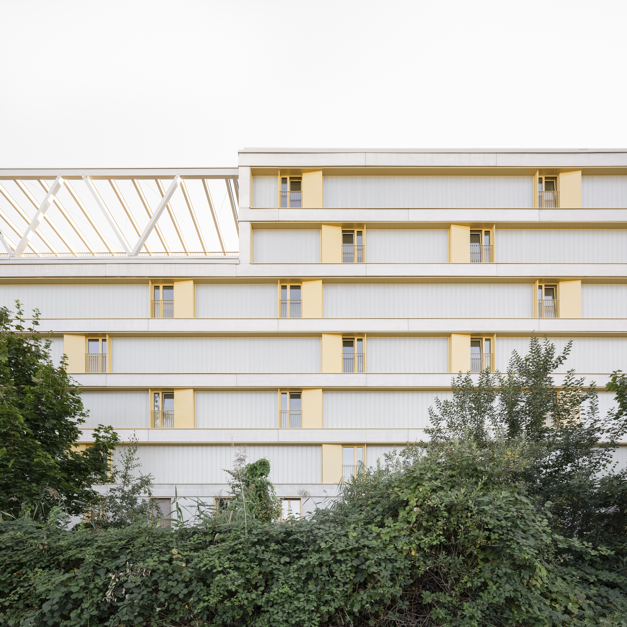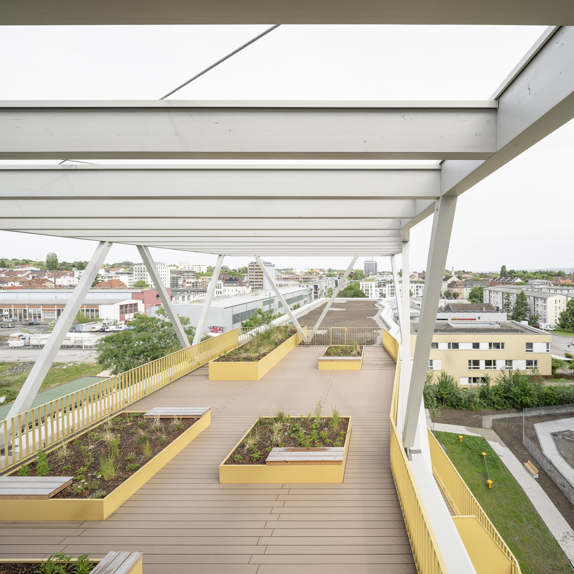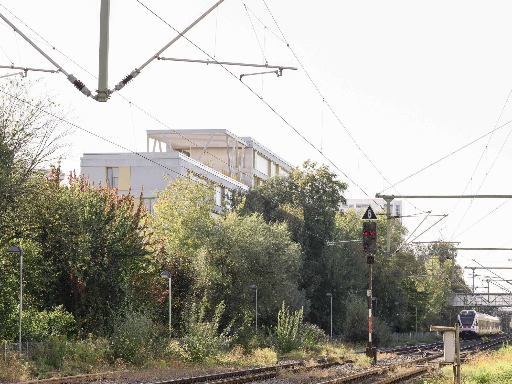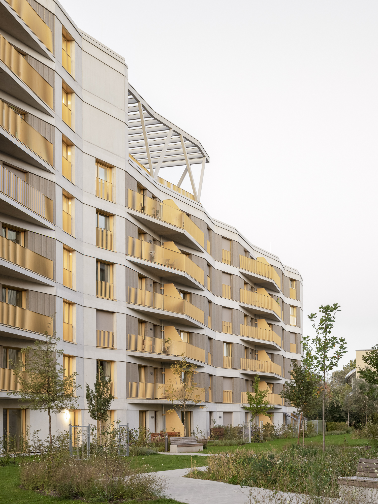 Ergänzt werden die Punkthäuser durch einen längeren, trapezförmigen Riegel im Norden, der durch seine gefaltete Fassadengestaltung gleichermaßen vielfältige Perspektiven ermöglicht und gleichzeitig eine wichtige städtebauliche Funktion übernimmt: Er schützt das Quartier effizient vor der Bahntrasse. Holz- und Betonfertigteilfassaden, variierende Farbnuancen sowie differierende Gebäudetiefen verleihen dem Ensemble eine lebendige, präzise abgestimmte Vielfalt und tragen zur Identität des gesamten Quartiers bei.