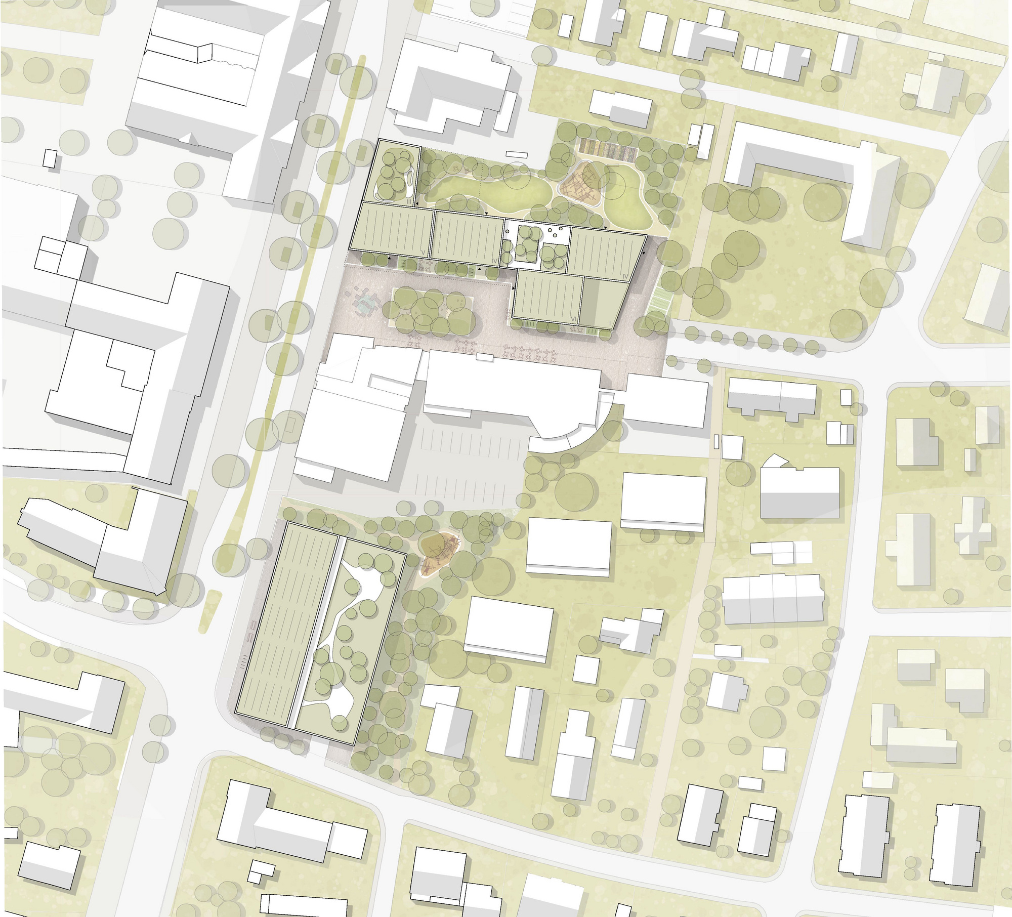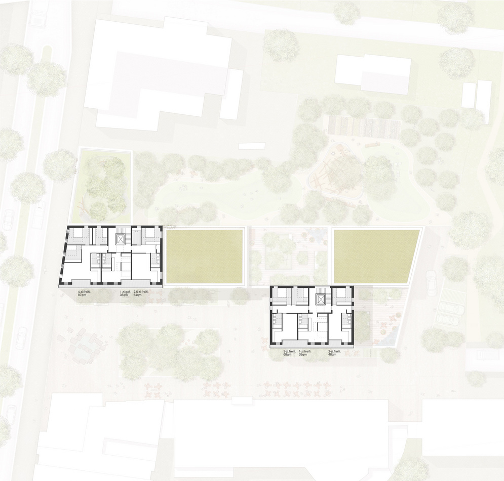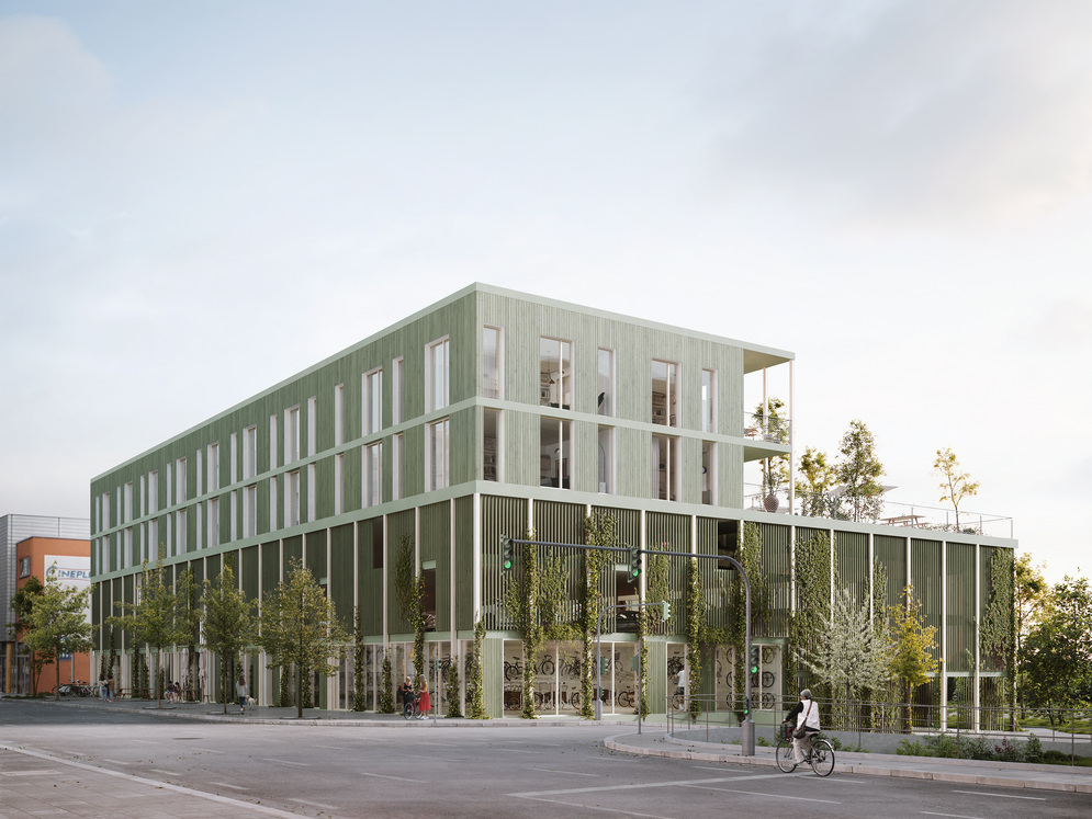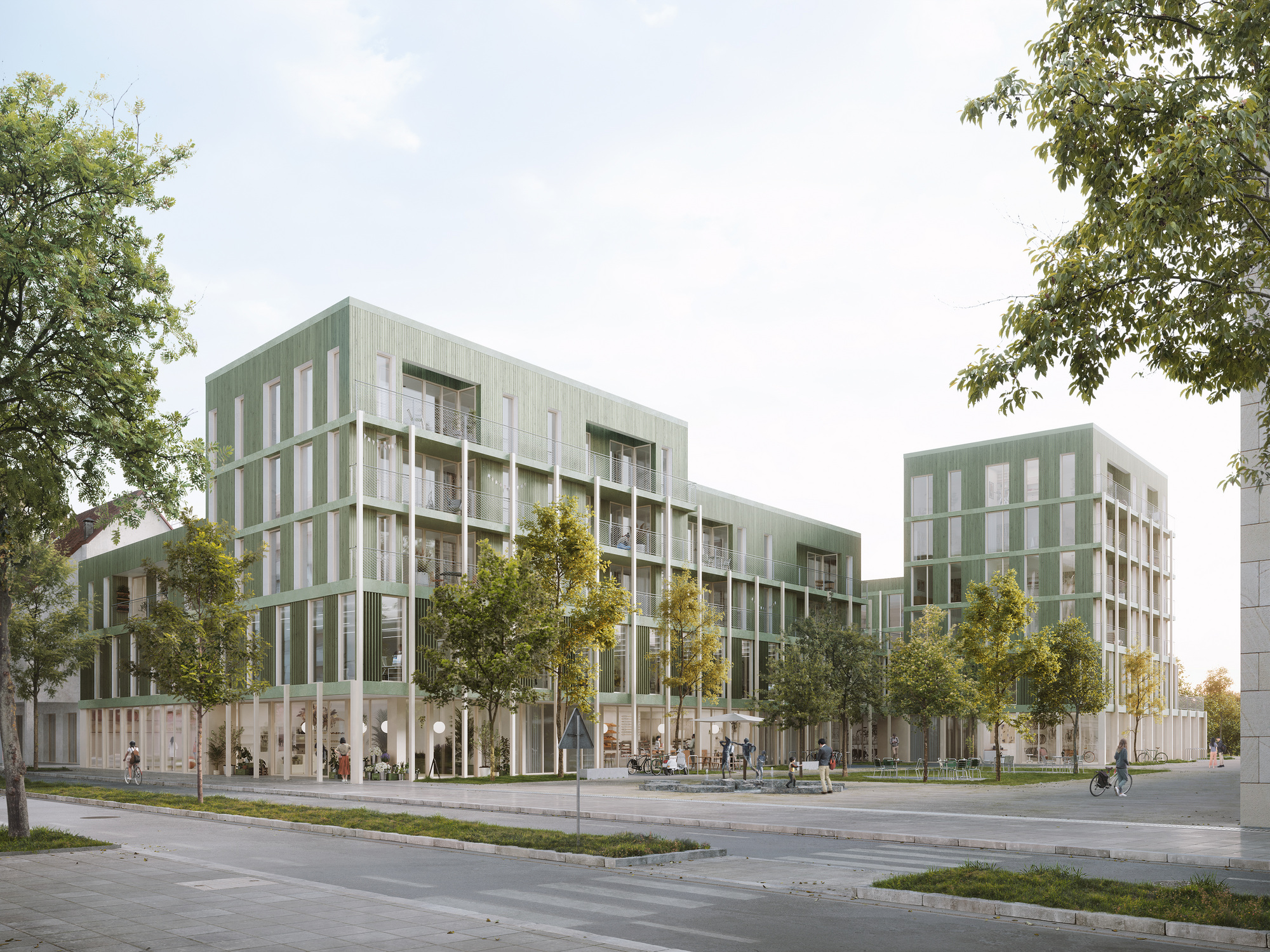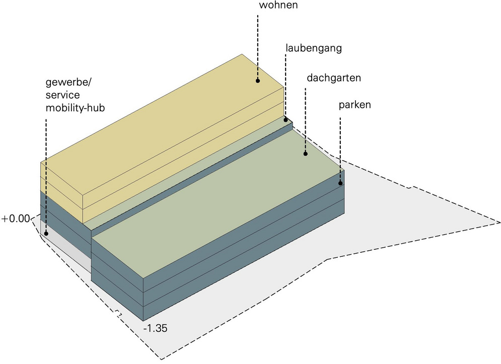Der Entwurf zeichnet sich durch einen geschickt gestaffelten Baukörper aus, der trotz der Größe auf die Umgebung mit einer feingliedrigen und differenzierten Volumetrie reagiert. Der Sockel des Gebäudes, bestehend aus dem Erdgeschoss und 1. Obergeschoss mit öffentlichen und gewerblichen Nutzungen, dient als Basis für die Türme, die für die Wohnnutzgen vorgesehen sind.