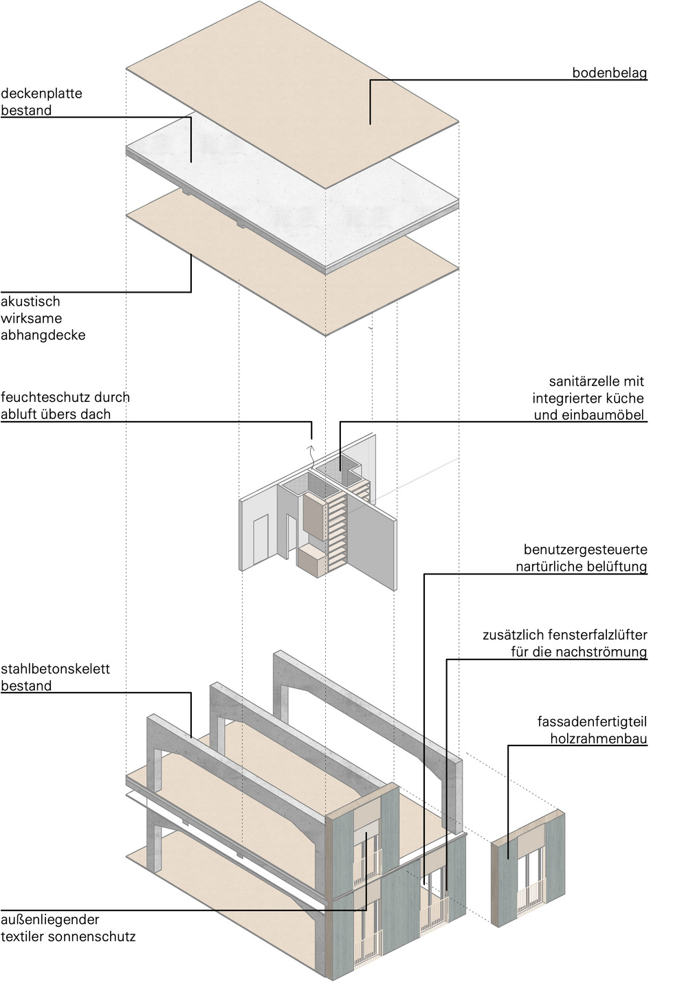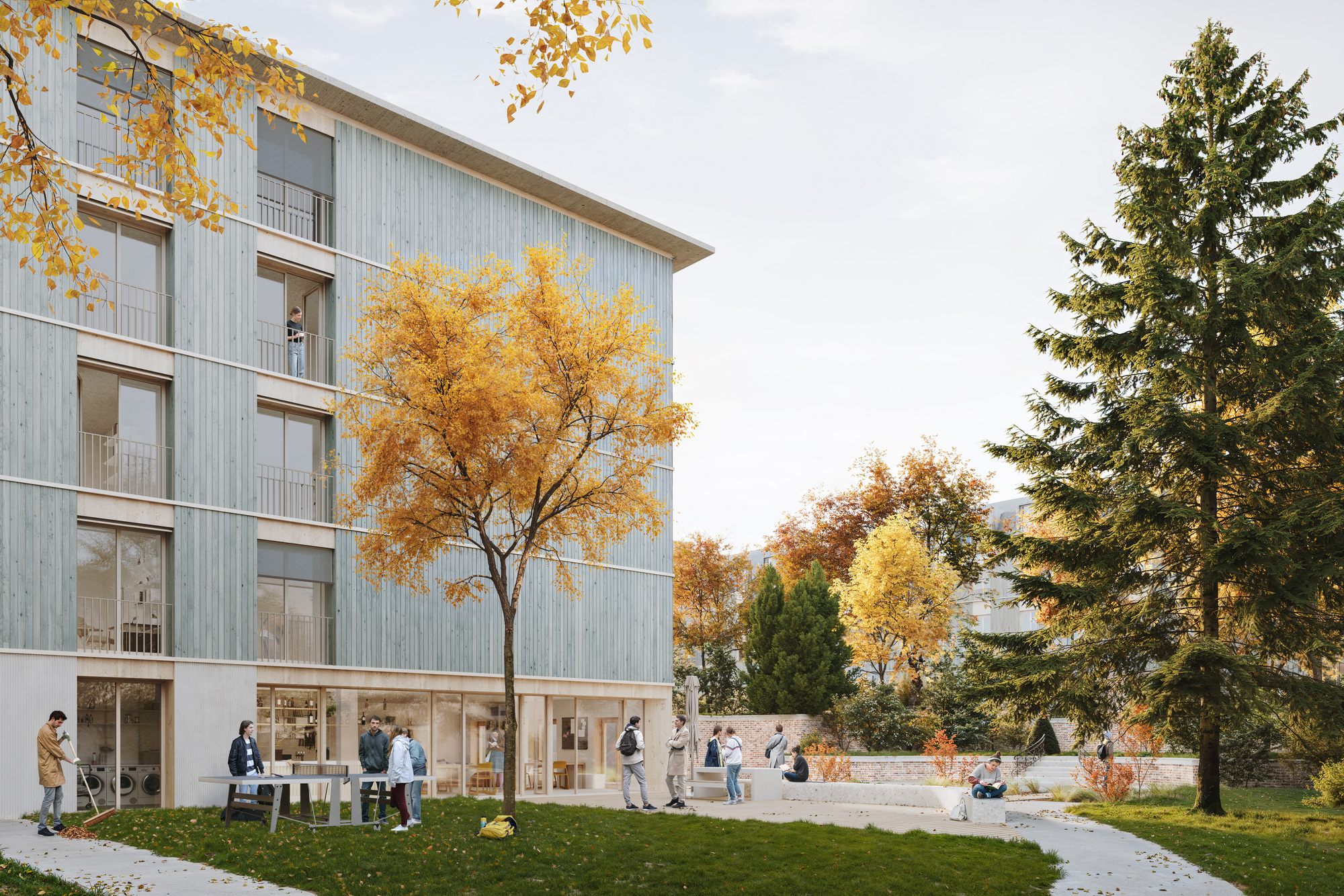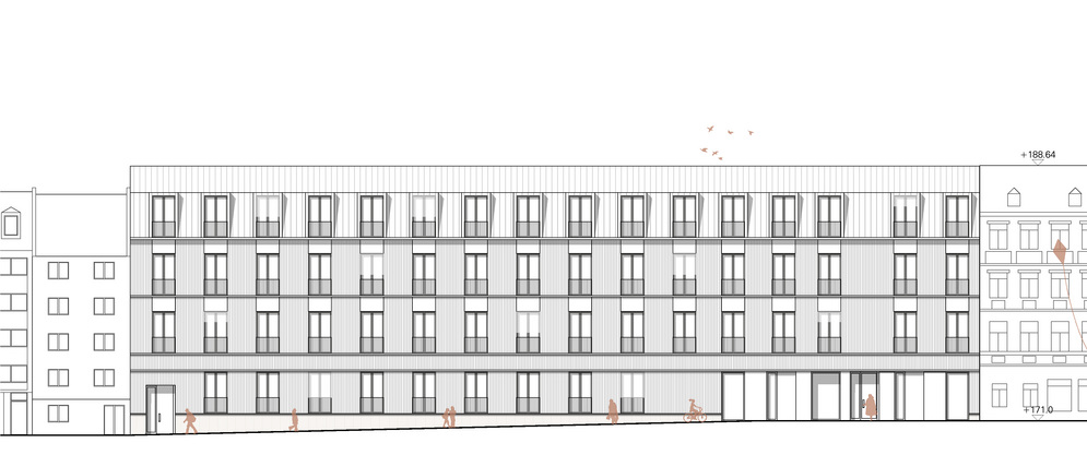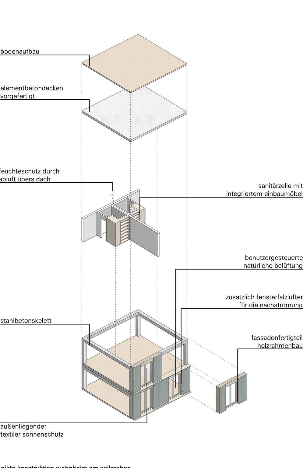 Das Bestandswohnheim am Seilgraben wird durch einen Neubau im rückwärtigen Bereich erweitert. Dieser schließt über den vorhandenen Anbau direkt an den Bestandsbau an. Der L-förmige Baukörper bildet mit dem Bestand eine Hof-in-Hof Situation und wirkt somit eher wie ein Teil des Blockrandes, im Unterschied zu der niedrigen und kleinteiligen Hofbebauung. Zudem hält er den nötigen Abstand zu den bestehenden Garagen und Freianlagen und ermöglicht deren Erhalt. Die Haupterschließung erfolgt weiterhin über das Bestandswohnheim am Seilgraben. Der zweite Eingang befindet sich im hinteren Hof.