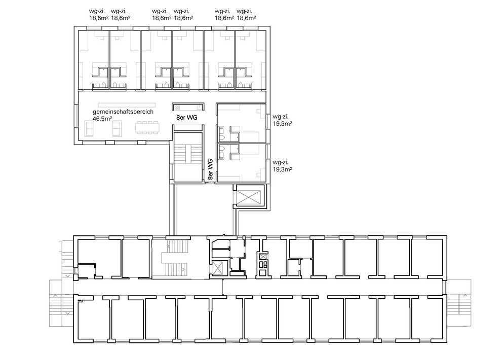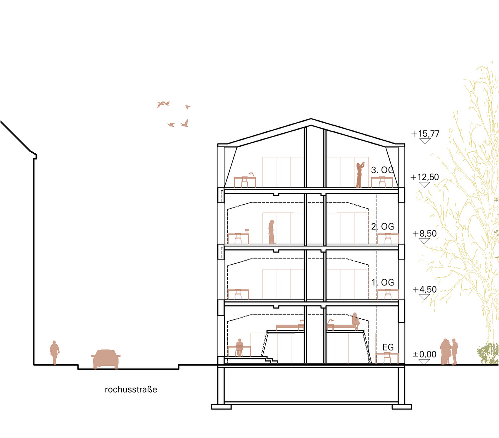 Die Tragstruktur des Bestandsgebäudes an der Rochusstraße ermöglicht eine gute und effiziente Raumaufteilung. Die Eingänge und Treppenhäuser bleiben in ihrer jetzigen Form erhalten. An den großzügigen Haupteingang sind Fahrradräume und ein großer Gemeinschaftsraum Richtung Süden mit Verbindung zum Garten angegliedert. Über einen Mittelgang ist der Haupteingang mit dem zweiten Treppenhaus verbunden. Hier sind erdgeschossig 19 Einzelapartments angeordnet, die durch die hohe Raumhöhe mit einer zweiten Ebene mit Schlafbereich ausgestattet werden können. Bei den Zimmern mit Orientierung zur Rochusstraße wird der Wohnbereich um 50cm erhöht, um mehr Privatsphäre zu generieren. In den oberen Geschossen werden über die beiden Treppenhäuser jeweils eine 8er-Wohngemeinschaft und weitere Einzelapartments erschlossen. Diese haben neben einer großen Gemeinschaftsküche mit Essplatz einen flexiblen (Plus-)Raum, der zum Wohnen oder Lernen genutzt werden kann, aber auch bei Bedarf zu einem zusätzlichen Zimmer ausgebaut werden kann. Im westlichen Teil gibt es zudem ein Doppelapartment mit einer kleinen Gemeinschaftsküche. Zwischen den Wohngemeinschaften gibt es Verbindungstüren, über die im Brandfall der zweite Rettungsweg erreicht werden kann, falls eine Abholung durch die Feuerwehr nicht möglich ist.