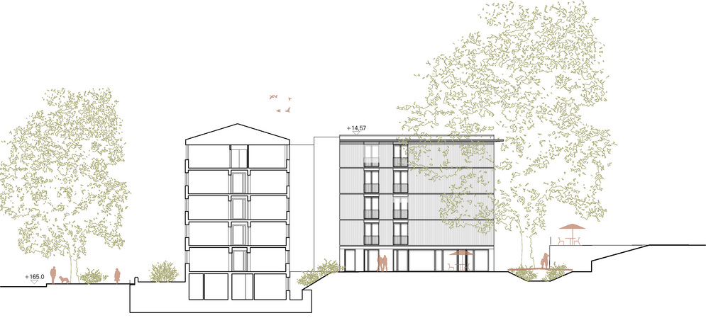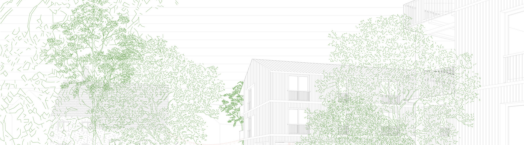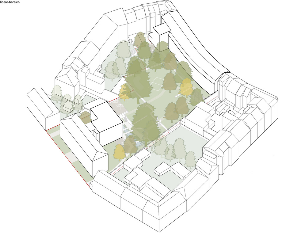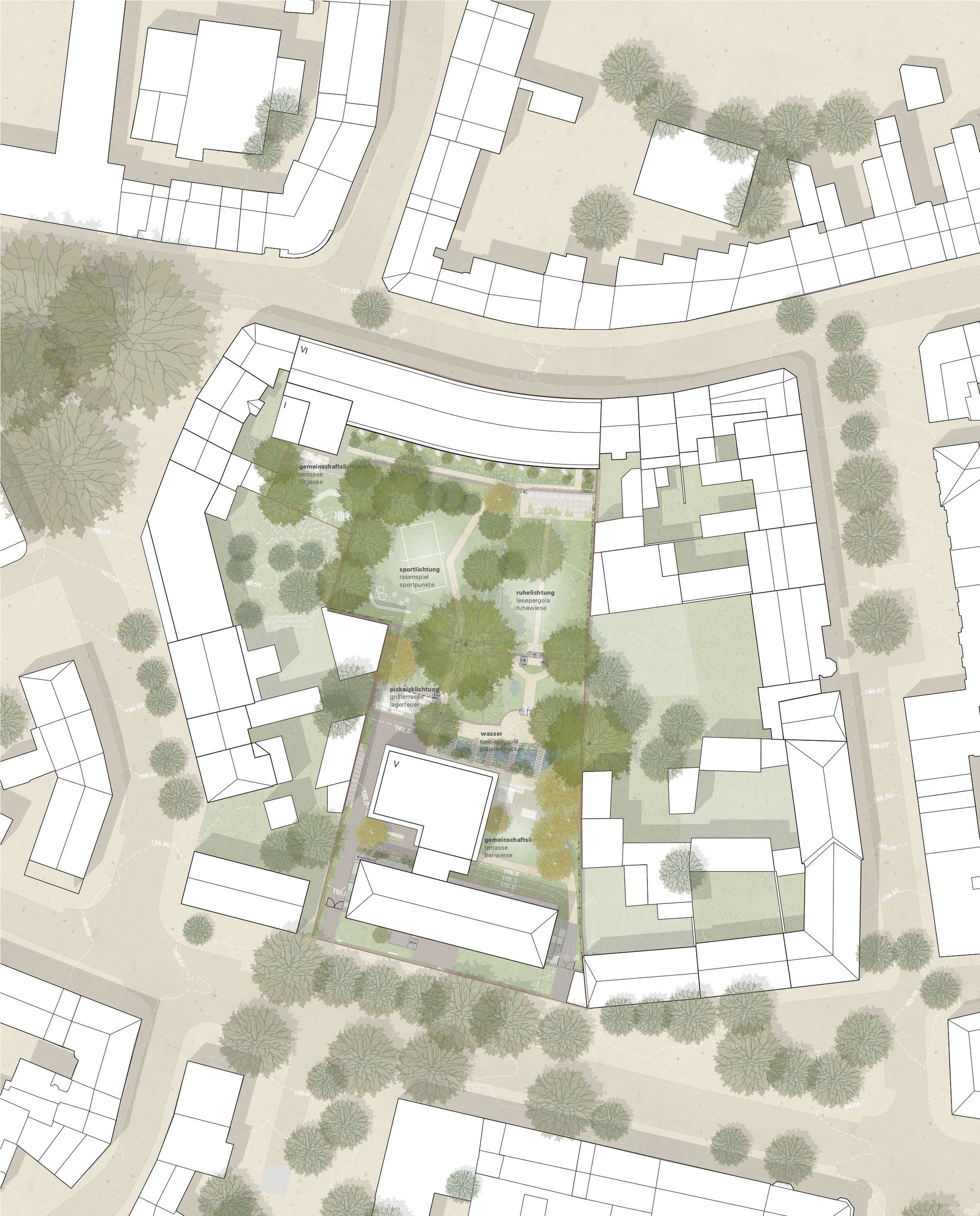 Die Neubauten fügen sich rücksichtsvoll in die bestehende Topografie ein, ohne die wertvolle Freiraumstruktur zu verändern. Diese Struktur mitsamt seinen Mauern, Baumbestand, dem historischen Baudenkmal und Höhenverläufen kann größtenteils erhalten bleiben und schafft eine einladende Atmosphäre mit Lichtungen, welchen unterschiedliche gemeinschaftliche Funktionen zugeordnet werden: