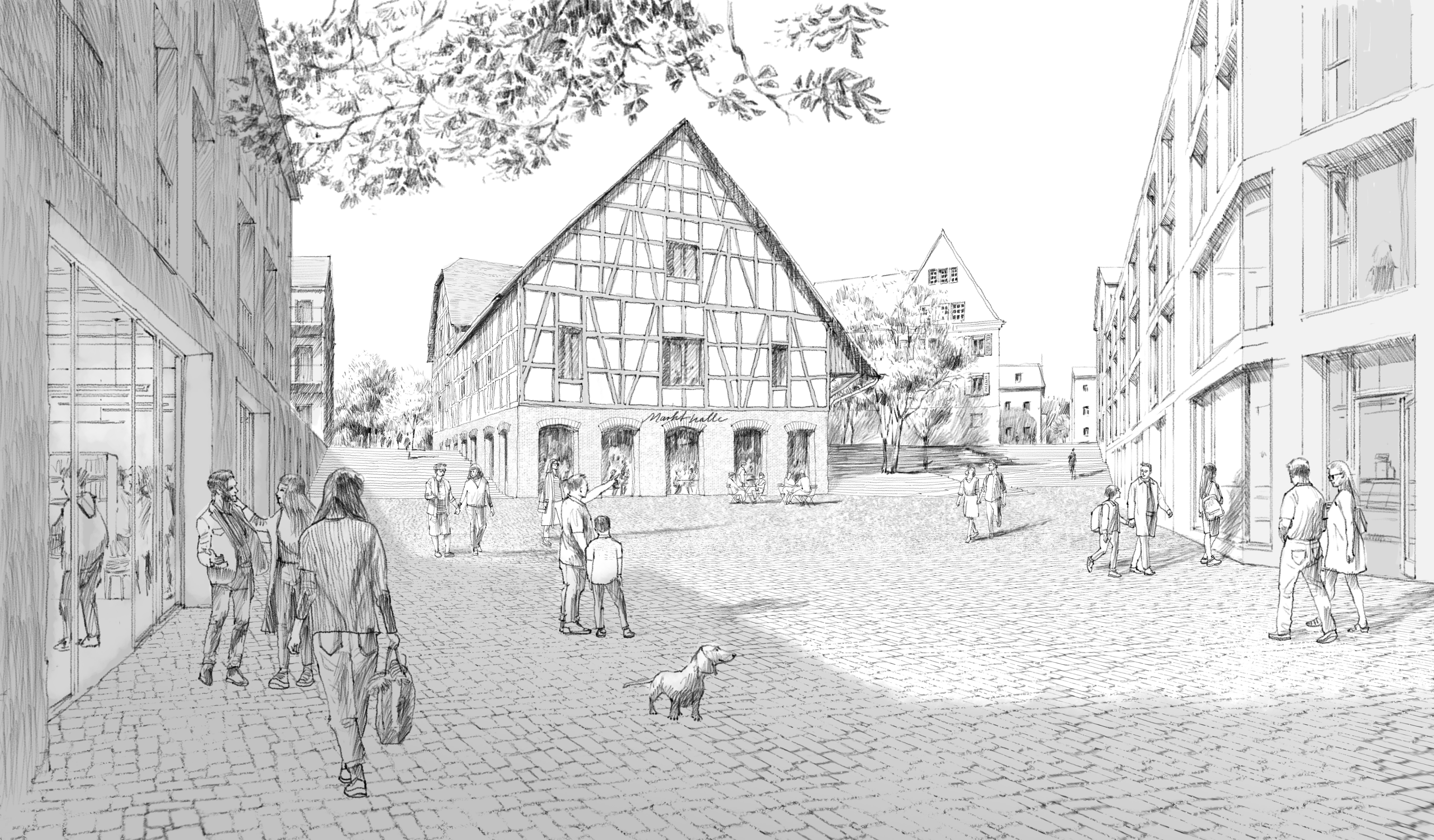 Am oberen Ende des linearen Angerraums in der Mitte sitzen die Markthalle und Kulturnutzung nebst Restaurant im alten Bauernhof. Dank der markanten Bestandsgebäude, die wir in Szene setzen, bildet sich hier ein attraktiver Abschluss als Gegenpol zum Marktplatz. Eine Spange wird hier aufgespannt, die die Altstadt beleben wird.