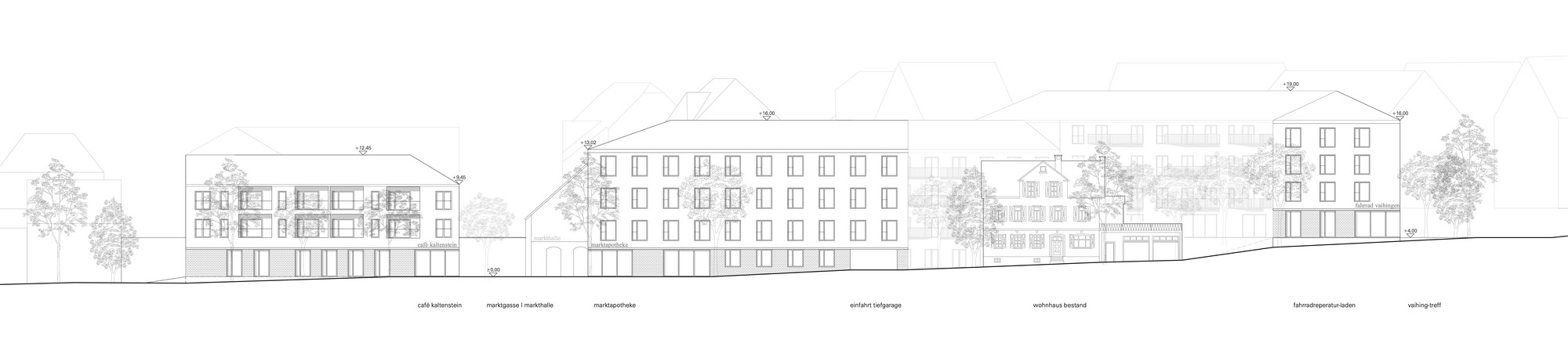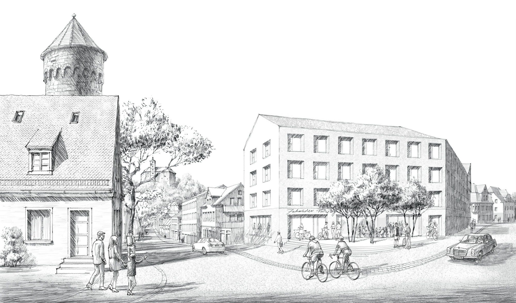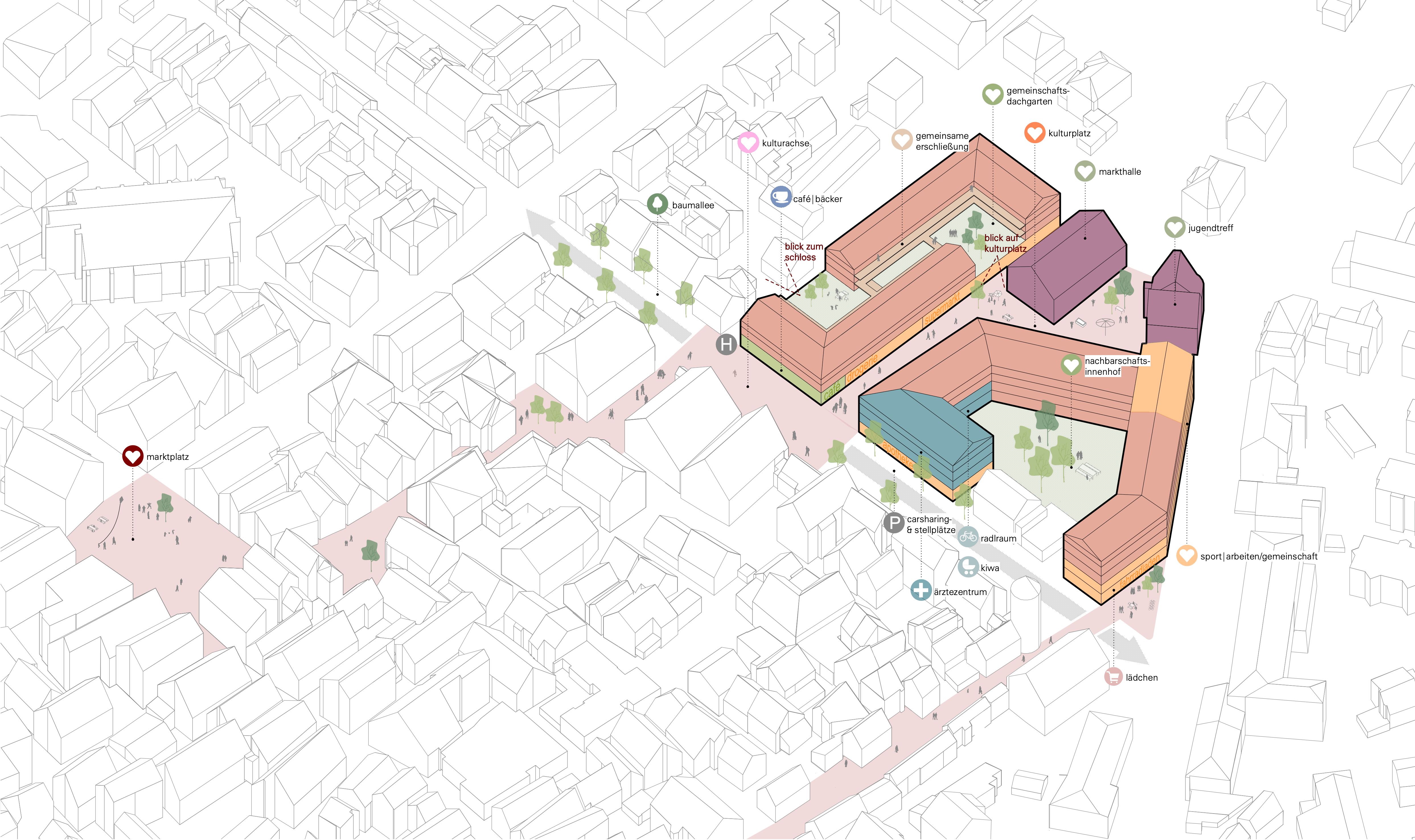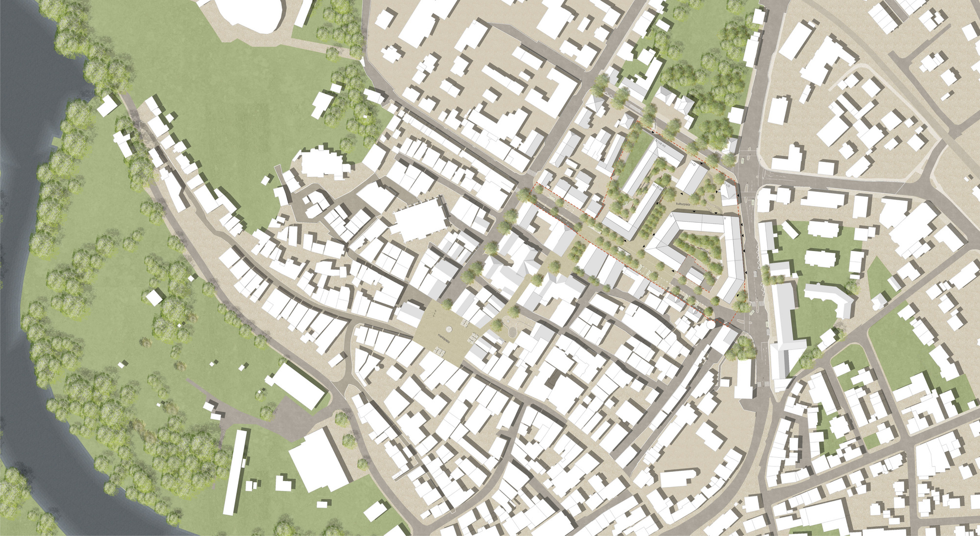 Im Zentrum der Stadterweiterung entsteht eine masstäbliche Platzabfolge, die als Erweiterung des öffentlichen Raumes vom Marktplatz nach Norden kommend das Stadtzentrum stärkt. Mit den Funktionsteilen, Vollsortimenter, Drogeriemarkt, Apotheke, Ärztezentrum aber auch Kulturplatz und Markthalle im alten Hof, wird dieser Angerraum aufgeladen und die Altstadt nicht nur ergänzt, sondern durch diese neuen Ankermieter auch gestärkt. Fusswege in die historische Altstadt sind kurz, Parken ist hier zentral möglich, alle Eingänge und Wege sind gebündelt und in Verlängerung und Ergänzung der Altstadt angeordnet.